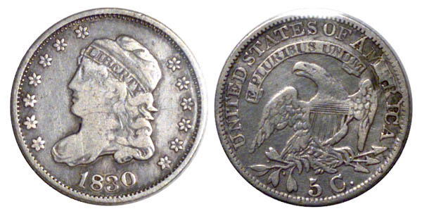| Logan-McCloskey Plate Coin, Page 67 as "Terminal State of 1830 LM-1.2." Light gray surfaces with fine hairlines in the fields. A second example of this scarce remarriage and rare with the retained cud on the reverse. This is considered the terminal die state of this reverse, the latest state observed by Logan and McCloskey. Retained cud through MER. From Coin Galleries' sale of July 1990, part of Lot 2437. The half dimes in this sale were from the collection of Eric Gutscher. |