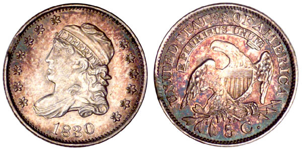 This is the second use of obverse 1 and the third use of reverse H. The obverse has a nearly vertical die crack from the border through cap to Y, continuing through the curls to the drapery. Several peripheral die cracks are noted through various stars. The reverse is lightly cracked through the right claw, with small die chips in N and M.