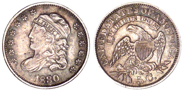 | Sharpness slightly finer with light hairlines, primarily on the obverse. Light gray surfaces with deeper toning along the obverse border. The reverse has light gold toning. A common variety available in higher grades. The first use of obverse 4 and also the first use of reverse K. The reverse has tiny die chips in D and M. |