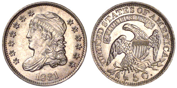 First use of obverse 1 and now the fifth use of reverse L. Stars 1 through 4 are connected with a very light die crack through the inner points. The reverse has die chips filling several letters of the legend. Several minor die cracks are also noted. A very heavy die crack connects the tops of UNIT.