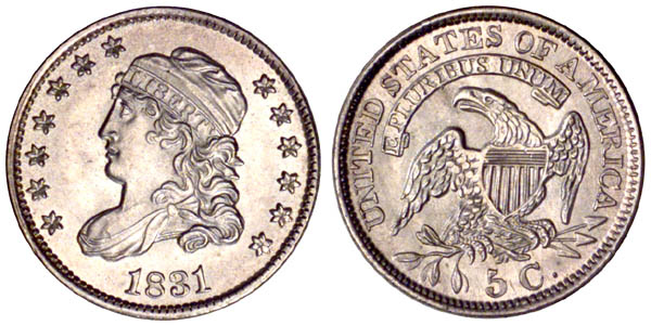 | Logan-McCloskey Plate Coin, Page 195. Fully brilliant with satiny silver lustre. A nicely centered impression with fully defined borders on both obverse and reverse. Liberty’s hair detail is boldly defined with sharp feathers on the reverse, very slightly weak just left of the shield. An outstanding example. This is the second finest of 15 examples listed in the Census. A common die marriage available in all grades including Proof. Previously certified MS-62 by PCGS. First use of obverse 2 and the fifth use of reverse M. Perfect obverse. The lower right side of F is filled. Rust pits are visible below RI of PLURIBUS, as well as below the left tail of the ribbon. From our sale of the Chris Schenkel Collection, November 1990, Lot 1150. |