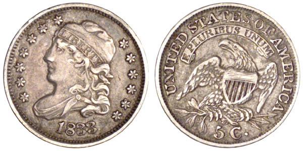The second use of obverse 3 and the second use of reverse Y. A very faint die crack from B in LIBERTY extends down through the hair curl. The reverse has a bulge through the horizontal shield lines with little definition in this area.