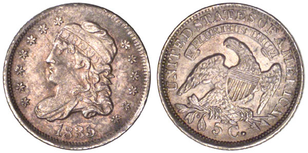 | Logan-McCloskey Plate Coin, Page 261. Light gray with hints of heather and gold. Minor blemishes are noted. This variety was first described by Will W. Neil in August 1927 in The Numismatist. Walter Breen later reported this in his 1958 supplement, noting that two examples were known, one in the Mint Collection and another offered by New Netherlands in the July 1954 issue of Numisma. Breen made no mention of the earlier article by Neil. Although a scarce variety, examples are known in all grades including Proof. First use of obverse 3 and the only use of reverse BB. Perfect obverse with very minor reverse die defects. |