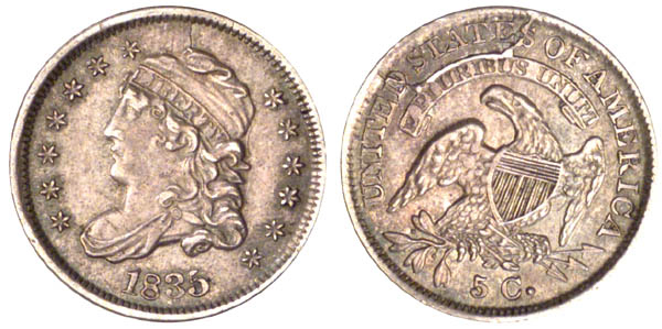 Second use of obverse 3 and the third use of reverse CC. Both dies were retired after this variety was minted. Parallel die cracks from the border to cap form a retained cud between. The reverse has an extremely heavy crack along top edge of the scroll, from rim through D and back to rim through final S.