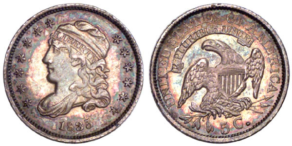 First use of obverse 5 and the seventh use of reverse DD. Perfect obverse. Reverse die cracks are very heavy, especially across top of the scroll.