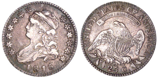 This lot marks the beginning of the Russell J. Logan Collection of Capped Bust quarter dollars. A total of 75 coins represent nearly all known varieties. In fact, the series includes exactly 75 varieties, although a few of the Logan coins represent varying die states. Of these 75 varieties, this collection includes 68 different. Those missing include 1820 B-3, 1821 B-6, 1827 B-1, 1827 B-2, 1831 B-7, 1836 B-5, and 1837 B-6 (very recently discovered). Very faint clash marks are visible on the obverse and reverse, particularly from the scroll through top of the date. In 1991 Stack's described this clash mark as: "Unlisted arc die break through the tops of 1815." This was the first coinage of the new Capped Bust design prepared by artist and engraver John Reich. Prior to production of these coins, the last quarter dollars were minted in 1807. Just one die marriage was coined in this year. The mintage included 69,232 struck in 1815 and another 20,003 coins minted early in 1816 and delivered January 10 of that year. The 1815 Mint Report recorded a total of just 69,867 coins produced at the Mint during the year. This coinage consisted of 635 half eagles and 69,232 quarter dollars. No other coins were produced. Mint Director Robert Patterson noted "The high price of gold and silver bullion for some time past in the current paper money of the country has prevented, and, as long as this shall continue to be the case, must necessarily prevent, deposits of these metals being made for coinage to any considerable amount." It was not a good year for the Mint with total coinage amounting to $20,483 and total expenses being $14,495.14, according to this document.