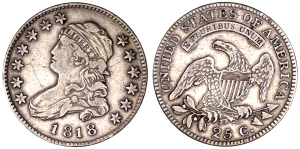This die marriage and remarriages of the same die pair were discussed by John W. McCloskey in "A Remarriage for the 1818 Bust Quarter" appearing in Volume 14, Issue 1 of the John Reich Journal. Early die states were minted before the Browning-9 variety while late die states were struck after the B-9 coins.