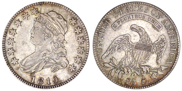 | Sharpness slightly finer. Cleaned and with splashes of light peripheral toning. This is the only variety among 1819 quarter dollars considered common. Less examples of this die marriage were recorded in the Census than any other variety of the year. The obverse was only used for this variety while the reverse was also used for 1819 B-4. Obverse and reverse nearly perfect with a very faint die crack from the border through star 11. |