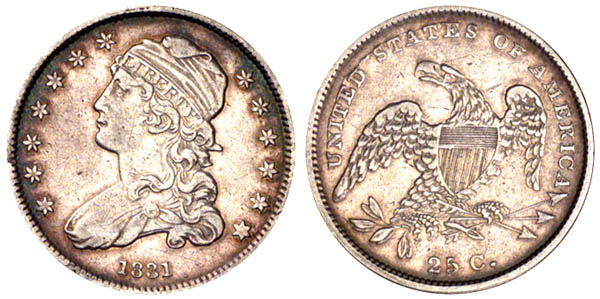 Late die state. The obverse die is perfect. The reverse is heavily cracked through the tops of UNITED STATES. A branch of this crack joins the border over upright of D. A second crack joins base of 25 C and period, continuing through the arrowheads and tops of MERICA.
