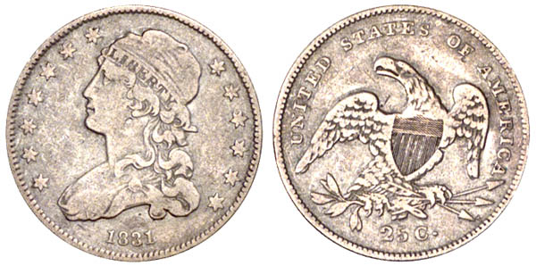 Cleaned with light pewter gray surfaces and noticeable hairlines on both sides. Among die marriages known to Browning, this is the rarest of the year. Obverse of 1831 B-2 and B-3, combined with a reverse also used for B-4.