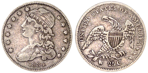 Attractive light gray surfaces with an X scratch on the reverse. This is a very scarce die marriage. From the obverse of 1834 B-1. The reverse was also used for 1834 B-5 and 1835 B-2.