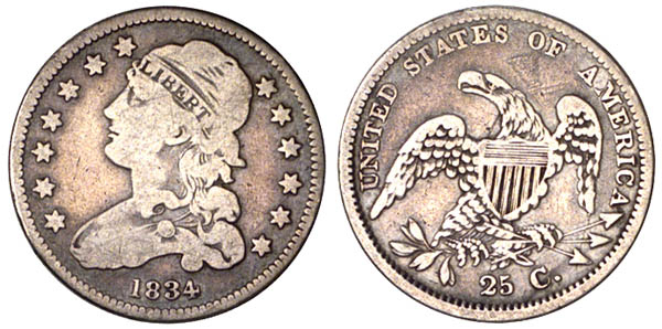 | Lightly cleaned with medium gray fields and light gray devices. Faint iridescent toning compliments the obverse. A few fine hairline scratches are evident. From the obverse of 1834 B-3, 4, and 5, combined with a reverse die unique to this variety. The obverse is cracked from cap to border over star 8. The reverse has very faint die cracks as described by Browning. |