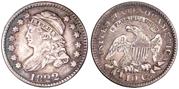 Stack's graded this About Uncirculated. Russ Logan recorded this in his copy of the Dime Book as AU-55 while listing the same example in the Dime Census as just EF-40. A scarce variety that may actually deserve a higher rarity rating. Just 14 examples are listed in the Dime Census with one finer than this. The only obverse die use. The reverse was later used for 1823 JR-1. Very faint obverse and reverse clash marks.