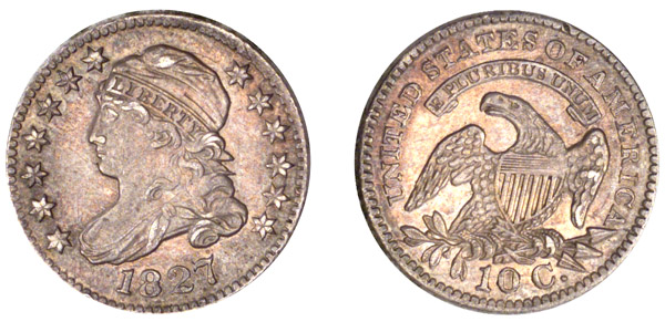 | A pleasing example with light gray surfaces highlighted by gold and iridescent toning. Some lustre remains evident. A few very minor hairlines and trivial surface marks are visible. Both examples of JR-8 in the present sale have doubling evident on the reverse. This doubling is quite similar on each example, however, is not identical. Such doubling in the modern era would be termed "machine doubling" or "shelf doubling," although on our early coins the connotations are more positive, adding charm to these wonderful coins. This is a very scarce variety that is difficult to locate above Very Fine. A single Proof example has been recorded. The Logan coin is second finest of 17 coins listed in the Dime Census.The obverse has a tiny die chip at right center of digit 8. Rim crumbling is evident on the obverse from 12:00 to 3:00. Perfect reverse. From Craig Whitford's sale of May 1995, Lot 1468. |