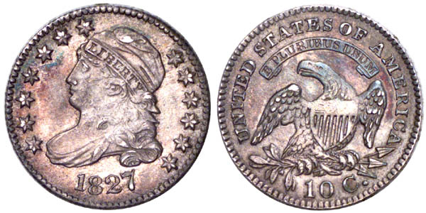 | Considerable weakness is present at central obverse and reverse. Lightly cleaned at central obverse, although considerable mint lustre is visible near the borders on either side. An attractive example with pale gold, heather, and iridescent accents. This is a common variety and is available in all grades through Mint State. Only one finer example is recorded in the Dime Census. Only use of either die. Perfect obverse and reverse. Purchased November 1983 from David Davis. |