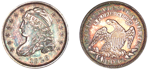 | A second example of this very scarce variety. Lightly cleaned although with the general appearance of a nearly Mint State coin. The obverse has natural bluish green, heather, and iridescent toning. The reverse is light gold with peripheral iridescent toning. Sharply struck with considerable doubling evident on the reverse. Described as "Extremely Fine 45" by Superior in 1982. Perfect obverse and reverse. From Superior's sale of June 1982, Lot 84. |