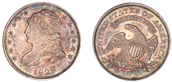 | This is an outstanding example with reflective fields beneath lovely gold and iridescent toning. In the Dime Book, an attribution point for the reverse die is given as "Lump over scroll below S1." A note in Russ Logan's copy states "not on all!" This example clearly does not have the lump as described and shown on the plate coin. Just 12 examples of this variety were recorded in the Dime Census with one possibly finer coin. This die marriage is very rare in Mint State. Third use of the obverse die after JR-4 and Jr-5 and the only use of the reverse die. The obverse has a crack from border through star 5 continuing faintly into the field toward Liberty's nose. The reverse is perfect. Purchased November 2000 from J.J. Teaparty. |