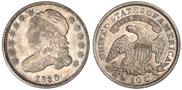 | Slightly weak central details on the obverse. Light gray surfaces with considerable lustre. The surfaces are lightly abraded suggesting an EF-45 grade to Russell Logan, however, the lustre suggests the higher grade we have assigned. This is the finest of any listed in the Dime Census. Two others are tied with Russ Logan's EF-45 grade. This die marriage is also known in Proof although none were recorded in the Dime Book. First use of the obverse die before JR-8 and second use of the reverse after JR-5. The obverse has a very light die crack through the curls at back of head from the ribbon to lowest curl. A tiny crack connects the upper and lower knobs of digit 3. Perfect reverse. The period in denomination is weakly visible. Purchased November 1982 at the CSNS Convention in Detroit, Michigan. |