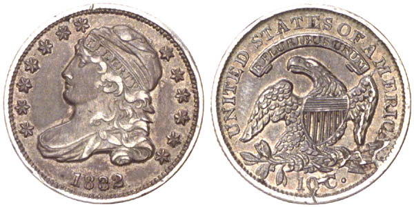 This is an extremely late die state with the die cracks at arrowheads forming a retained cud. Additional die cracks through the arrows and denomination are very heavy, with several die chips along these cracks.