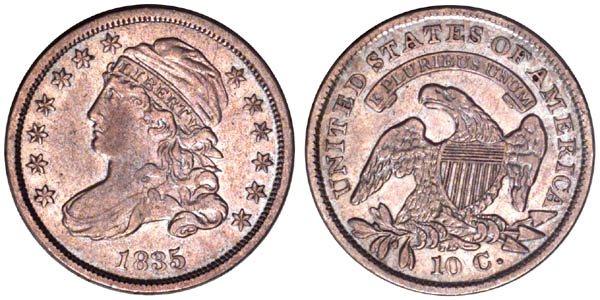 | Lightly cleaned with bright silver surfaces and faint pinkish gold toning. Trivial surface marks are consistent with the overall quality. Only one finer example is listed in the Dime Census. This is the third use of the obverse die after JR-6 and JR-7. The reverse is in its first use before 1836 JR-3 and 1837 JR-1. Perfect obverse and reverse dies. |