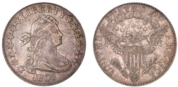 | Attractive heather surfaces with hints of amber toning. Very lightly abraded. This example may be within the top dozen known for the variety. The prime state of this die variety, described by Overton as having "12 arrows" apparently does not exist. The obverse has extremely heavy clash marks. This reverse has a very heavy die crack through the tops of MERI, faintly to C. Purchased August 1979 at a Toledo, Ohio coin show. |