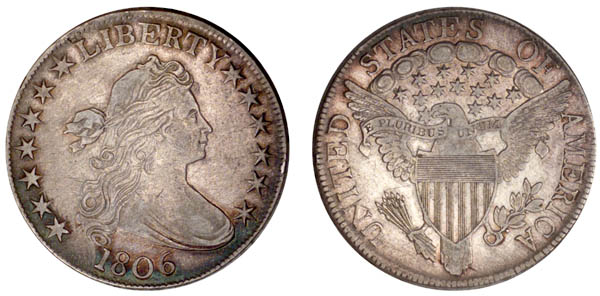 This is the first of the Pointed 6 varieties and is a distinctive Guide Book type without the branch stem continuing through the eagle's claw. Light obverse clash marks. Russ Logan held this in his collection as "O-109a" although it appears to be the prime state of these dies to our eyes. Although stars and letters are drawn to the edge with very little milling, there does not appear to be any evidence of the die cracks described for the later die state.