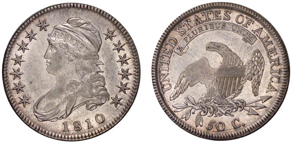 The obverse is cracked at base of the date with this crack extending left to the border outside star 3 and right to the outside points of stars 12 and 13. The reverse is cracked through the tops of UNITED STATES OF AM with die chips along the crack at D and S.
