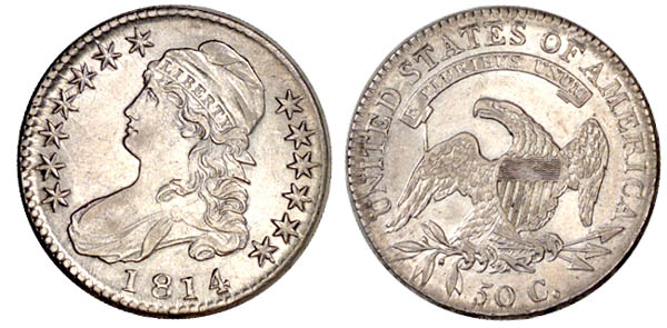 | Bright silver surfaces with frosty lustre. A few very slight abrasions are noted. Although no doubt cleaned, this example retains considerable aesthetic appeal. The obverse border is weakly defined from 12:00 to 3:00 with similar weakness along the reverse border. Both obverse and reverse have prominent clash marks. Aside from the heavy defect ridge from left wing to scroll, there is no evidence of other die damage. Purchased March 10, 1989 from Sheridan Downey. |