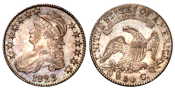 | Considerable lustre is present on both sides with attractive iridescent toning over very light gray surfaces. Golden brown toning highlights the devices. Both obverse and reverse have several peripheral die cracks. From Sheridan Downey's Sale #18, September 1996, Lot 22. |
