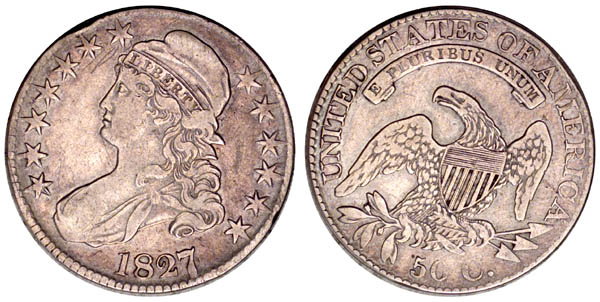 | Doubled edge. Evidence exists that the edge may have been tripled. Lightly cleaned with pale gray surfaces. A small obverse rim bruise is at 11:00. A reverse rim flaw is at 2:00. Minor scratches at upper left obverse. FIFFTTYY CCEENNTTSSS OOORRR HALFA ADOLDLOALRLAR. The "1827/6 O-103" half dollar was mis-attributed and is actually an example of O-119. Purchased April 1, 2000 from Charles Erb. Ex Pat Patton. |