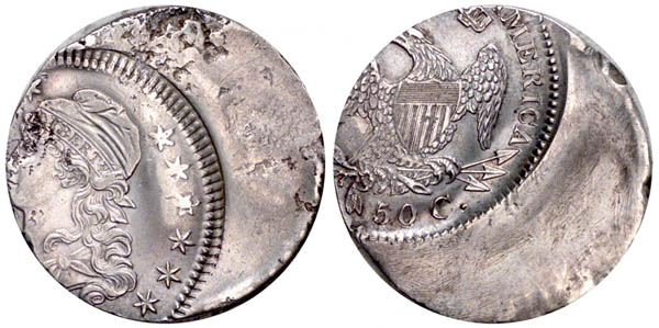 Illustrated as Figure VI in Russ Logan's article about off-center half dollars in Volume 9, Issue 3 of the Journal. Russell Logan was not only a collector, but was a student of the early coinage. He considered error coins to be important windows into the technology of our first Mint. Many of the coins in his collection were struck off-center, and the present offering may be the single largest gathering of these coins ever to be sold at public auction. His article about the study and descriptive methodolgy for these off-center coins was well-thought out and very well written. He used calculus to determine the magnitude of off-centering, and prepared a simple chart to provide the theoretical percentage off-center of any coin, based on two simple measurements. In the course of his article, he provided all of the necessary details for describing an off-center coin, including the magnitude, direction, flatness (or lack thereof), doubling of strike, and edge description.